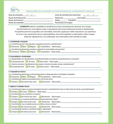 Promovemos avaliações periódicas dos profissionais parceiros, para assegurar a qualidade dos serviços prestados, garantindo um feedback por parte dos pacientes, familiares e cuidadores, facilitando ajustes em busca da excelência no atendimento. Oferecemos treinamento especializado em normas e procedimentos no atendimento domiciliar, garantindo um serviço de alta qualidade, com CERTIFICAÇÃO ao final do treinamento, reconhecendo a capacitação profissional.